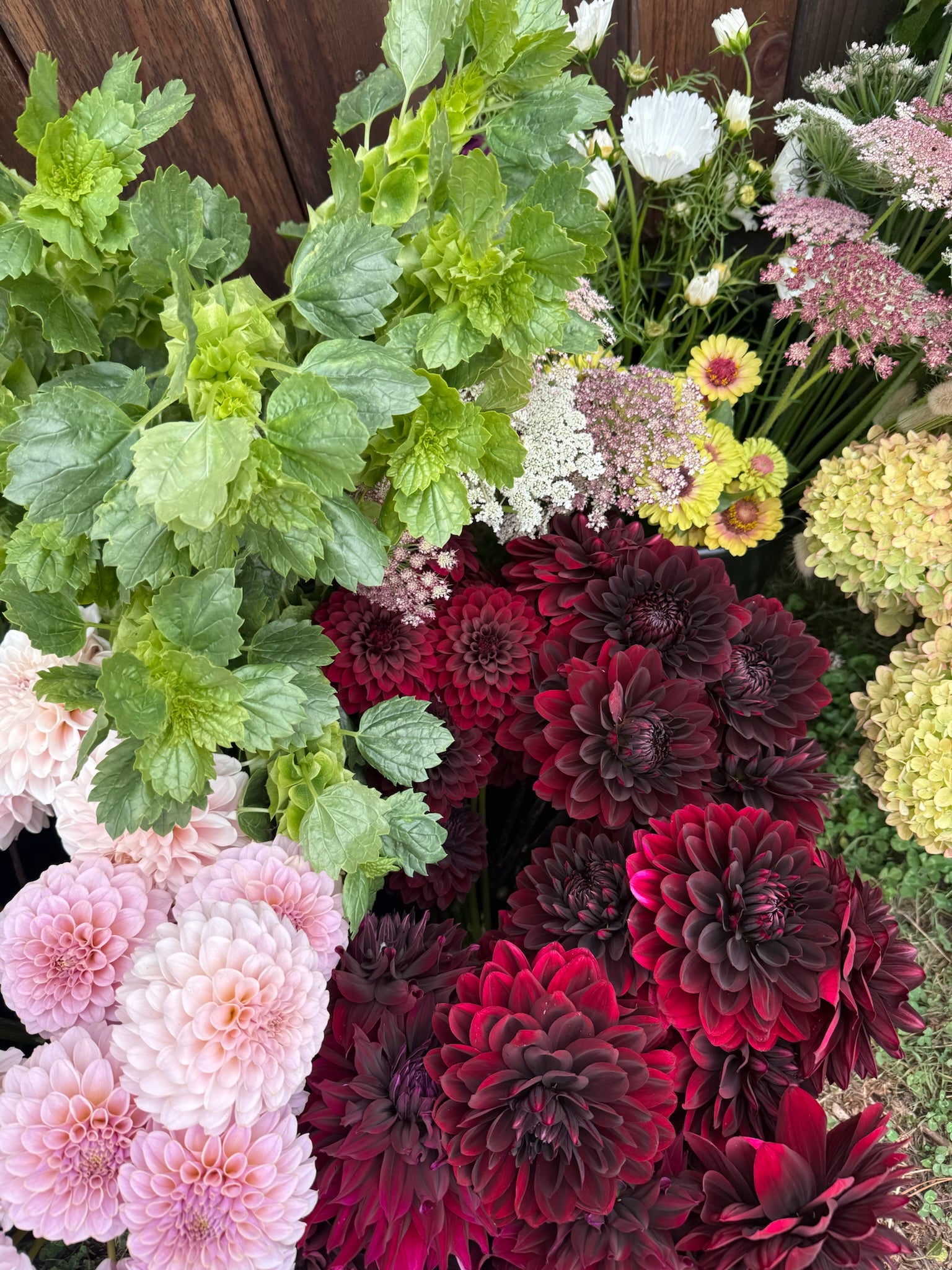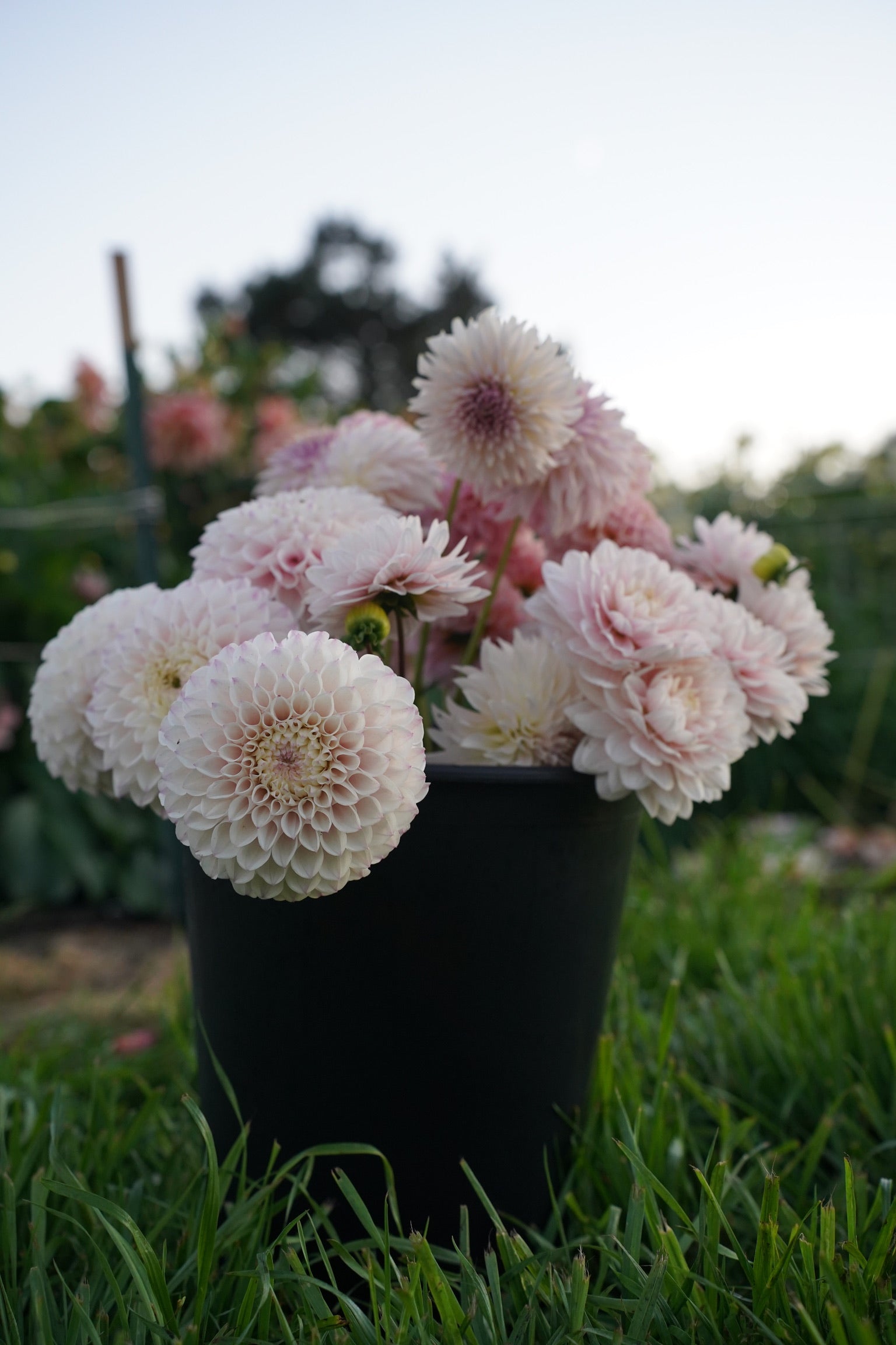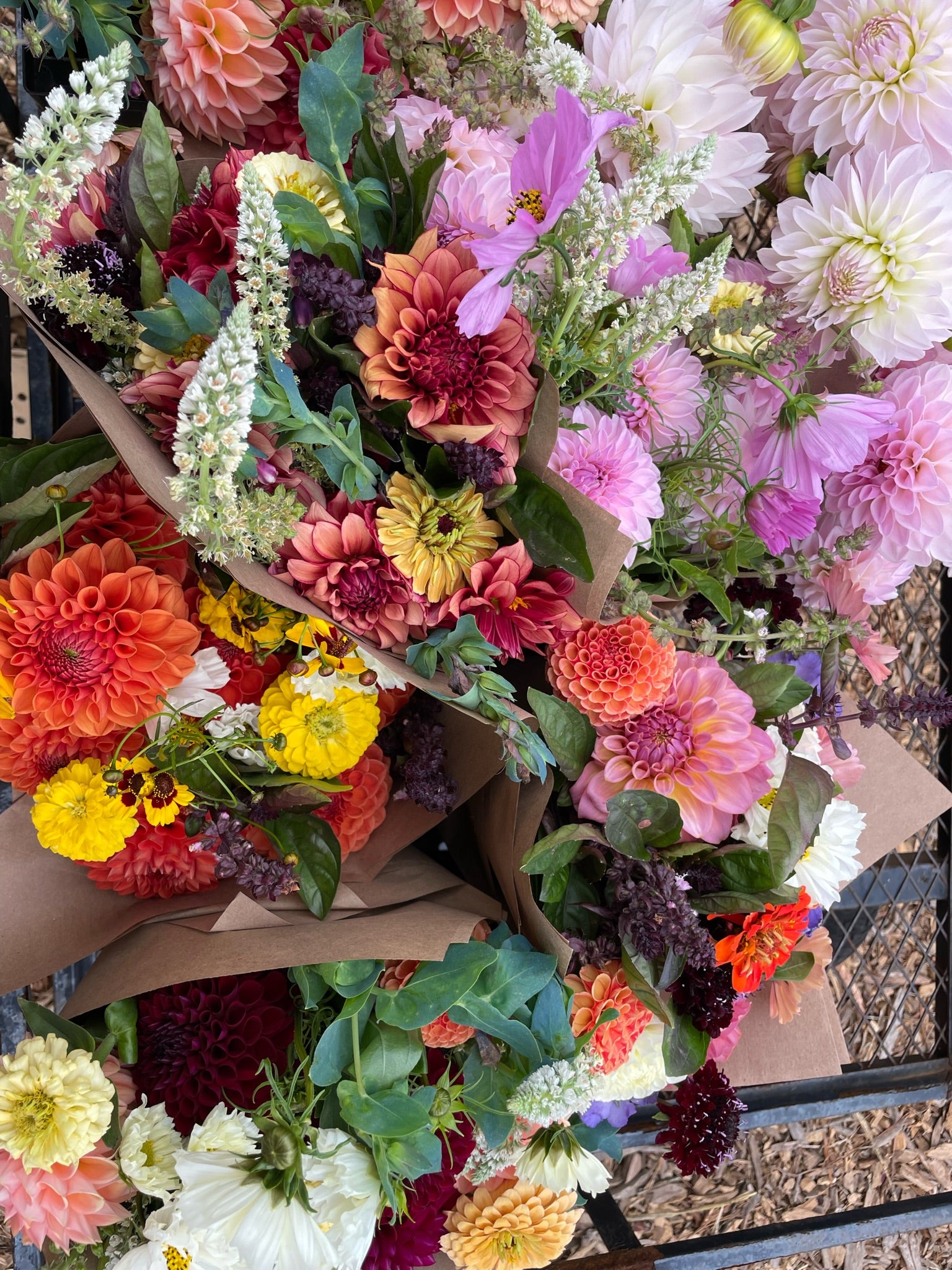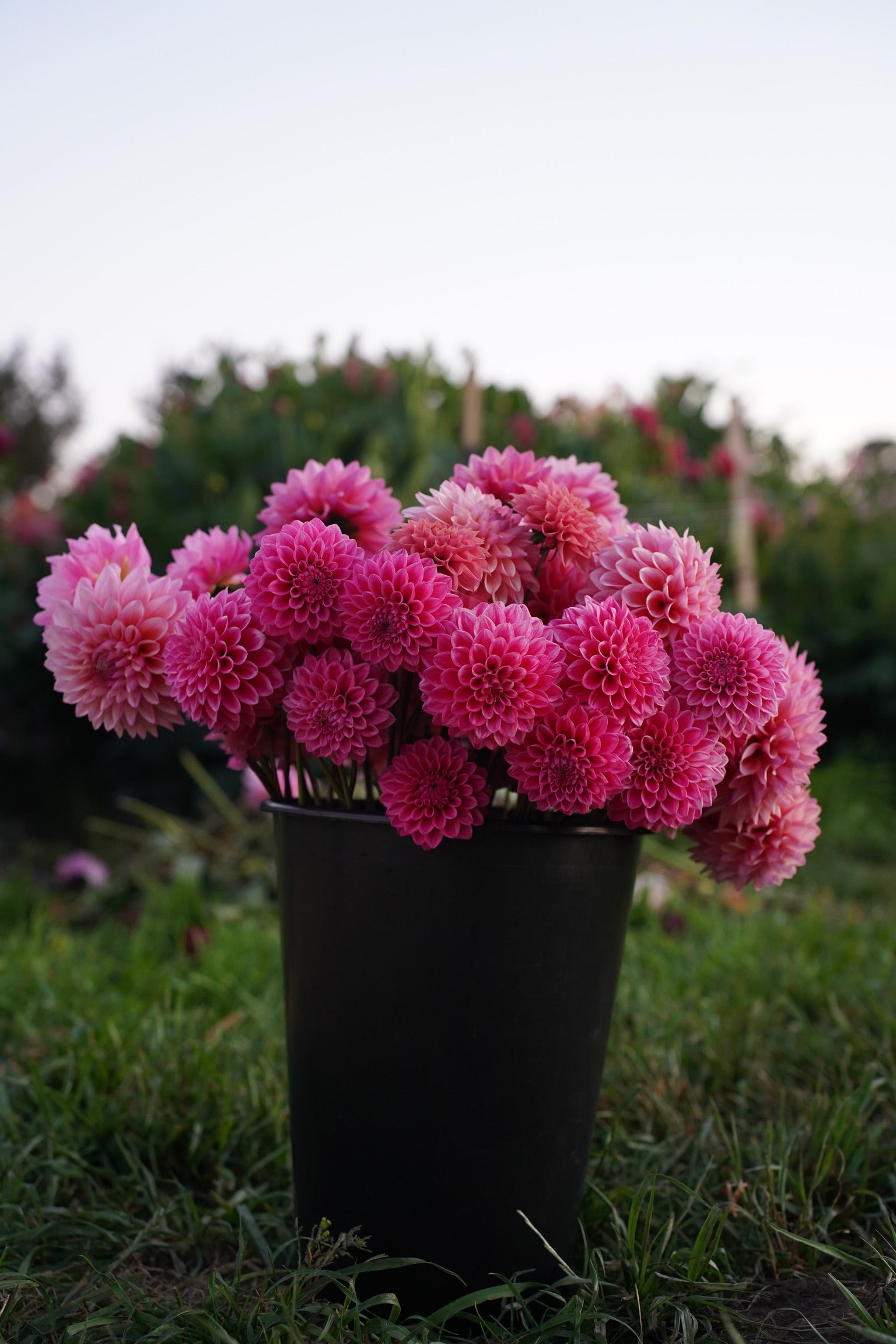 We offer two types of DIY Flower Buckets: Mixed Flower Buckets, which contain approximately 50 to 70 stems of annual flowers and foliage, and Dahlia Buckets, which contain approximately 30 to 40 assorted dahlia stems. For reference, a simple mason-jar arrangement may take up to 20 stems, and a small bouquet will take up to 25-30 stems.