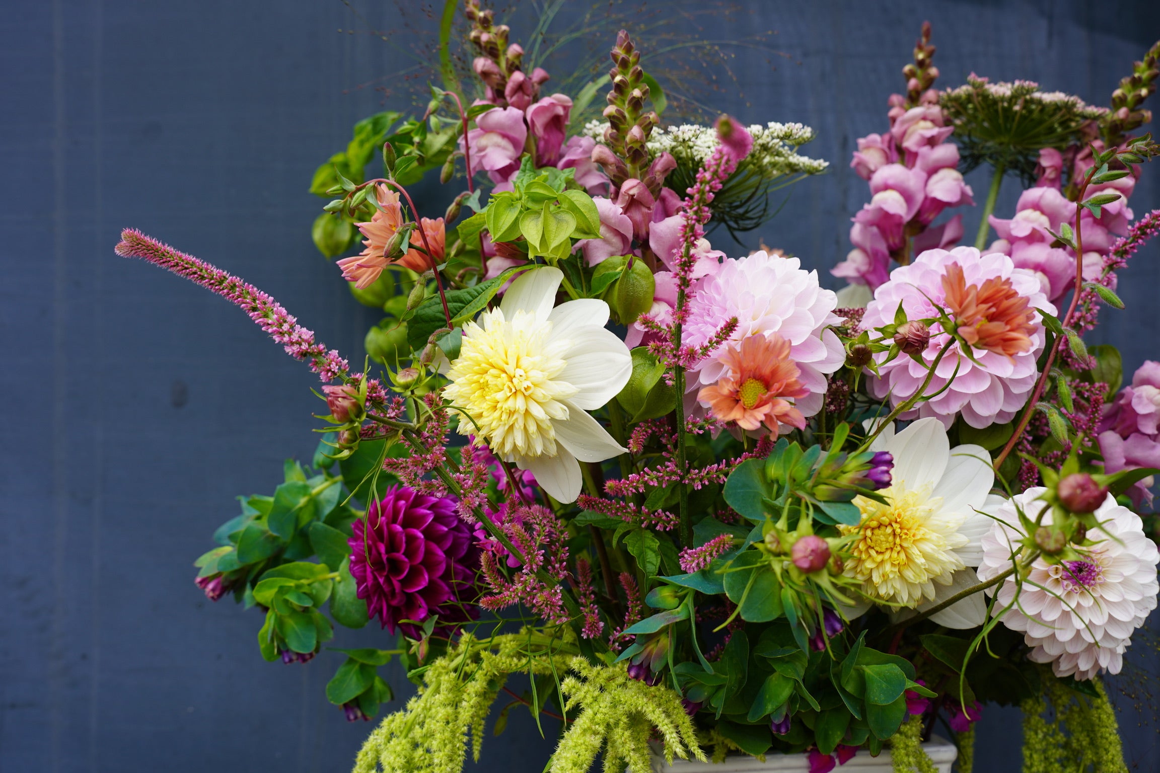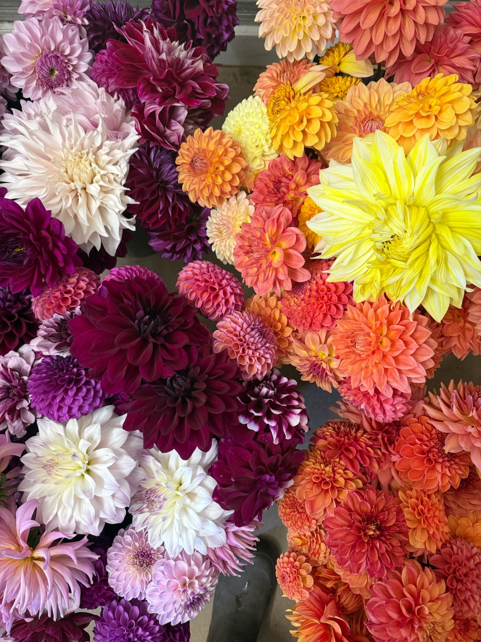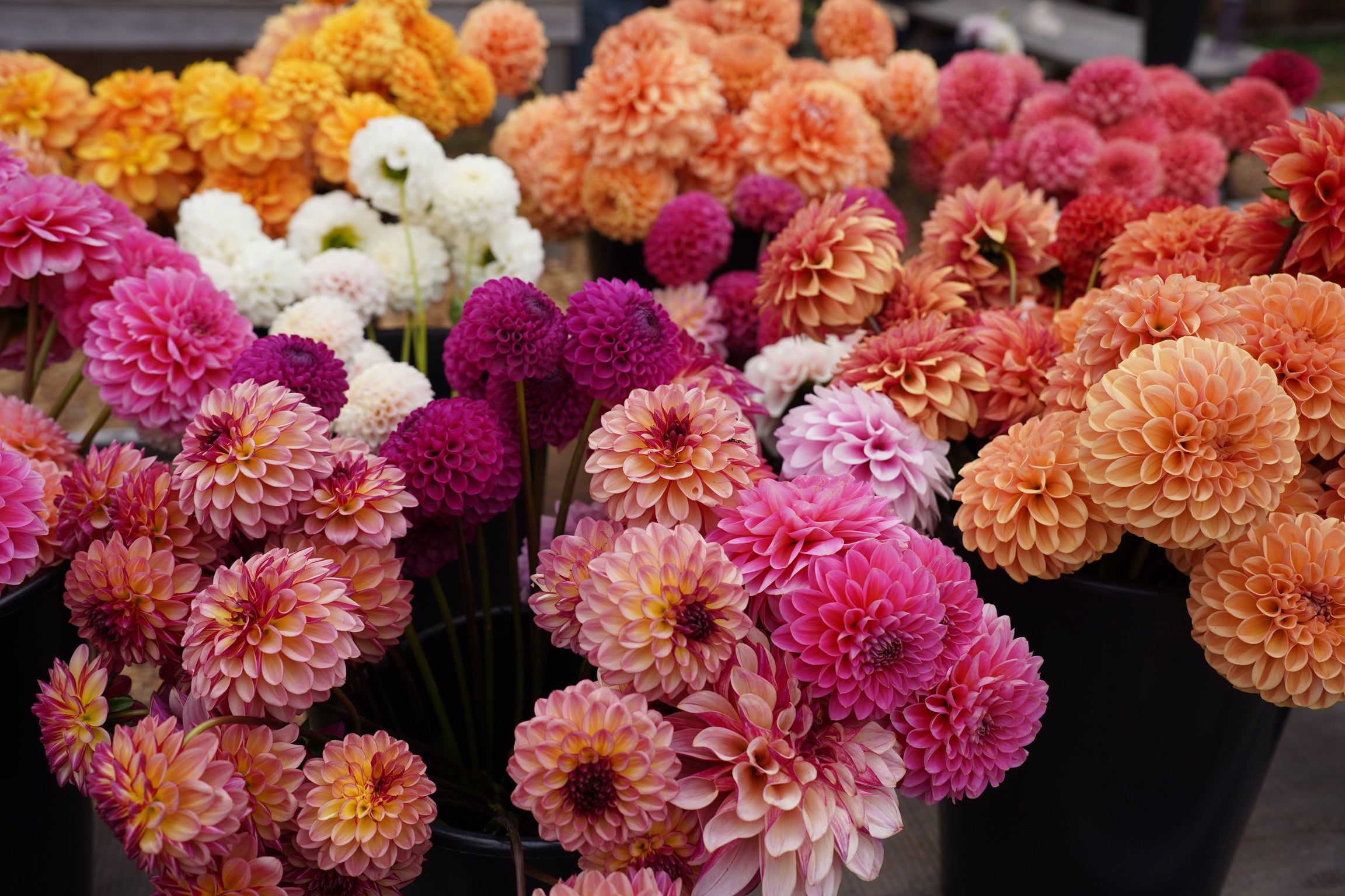 We offer two types of DIY Flower Buckets: Mixed Flower Buckets, which contain approximately 50 to 70 stems of annual flowers and foliage, and Dahlia Buckets, which contain approximately 30 to 40 assorted dahlia stems. For reference, a simple mason-jar arrangement may take up to 20 stems, and a small bouquet will take up to 25-30 stems.