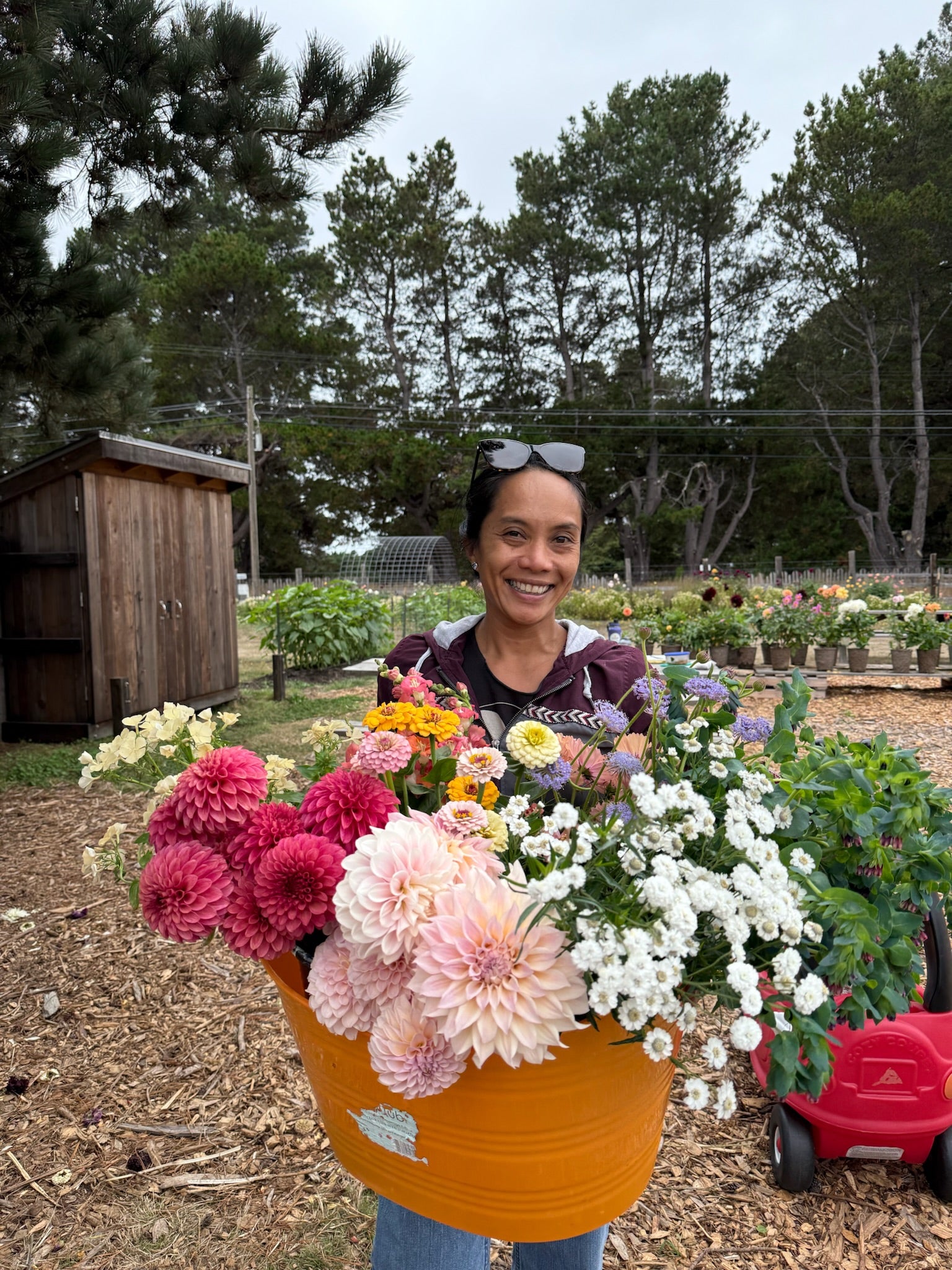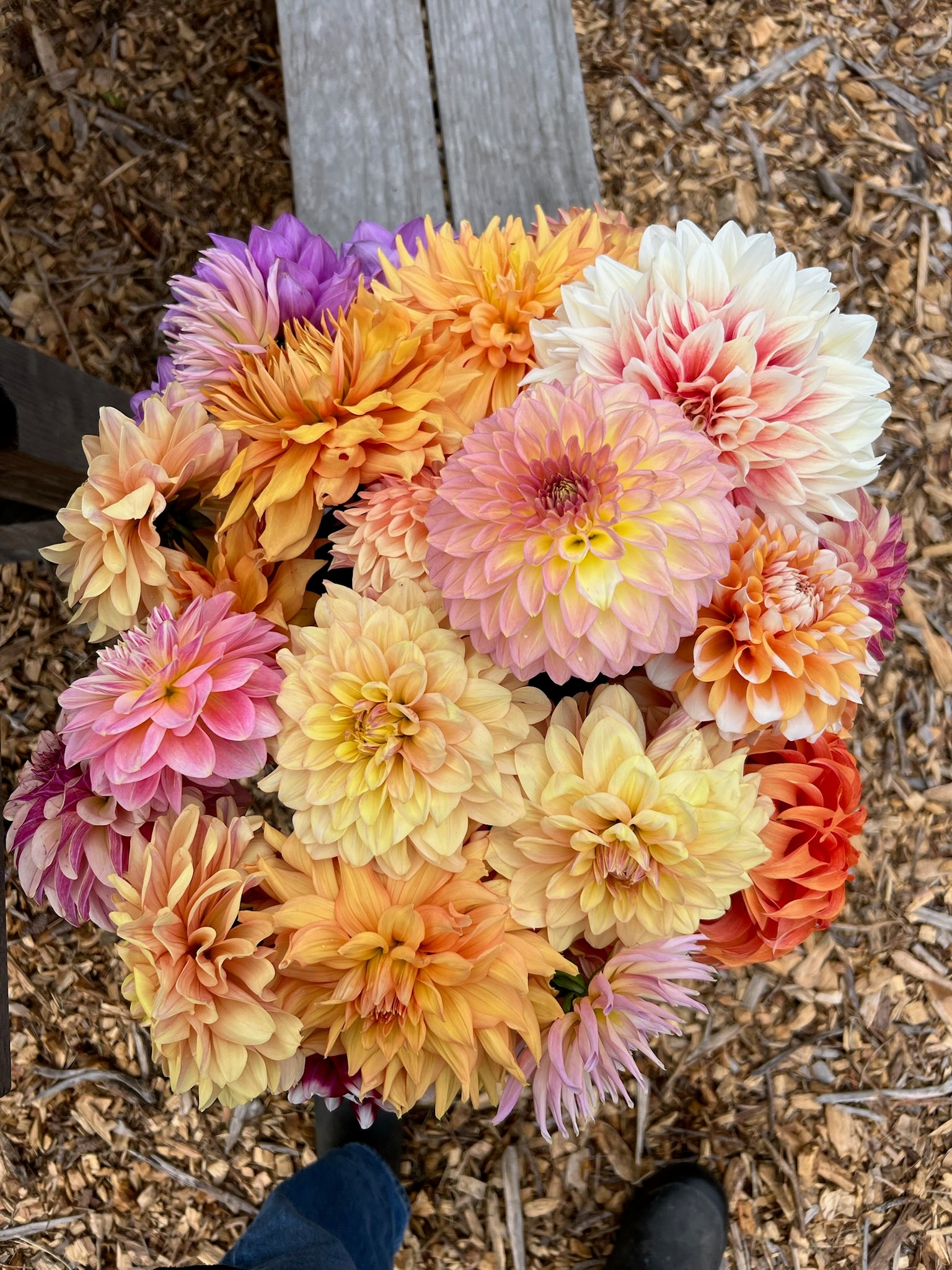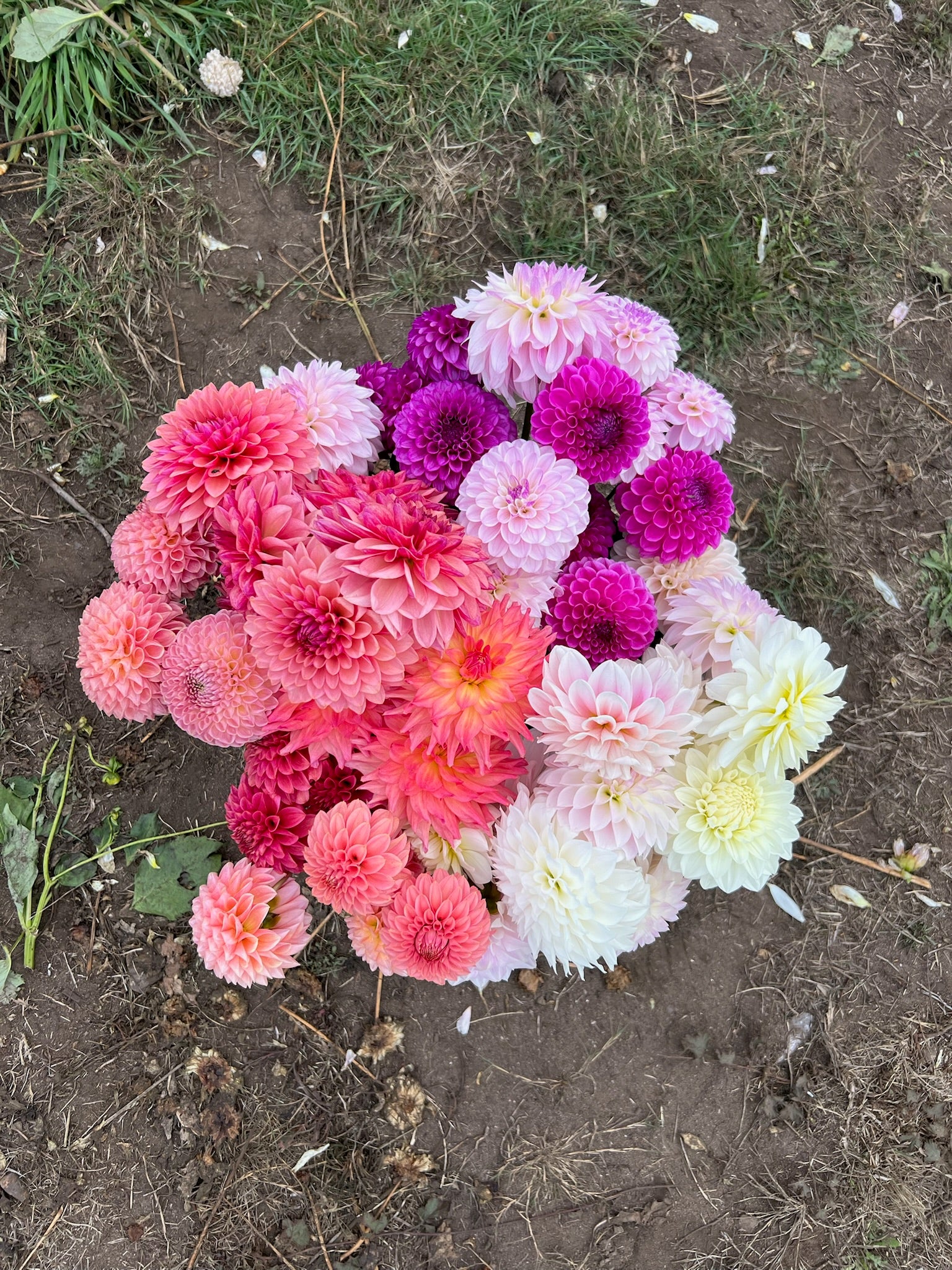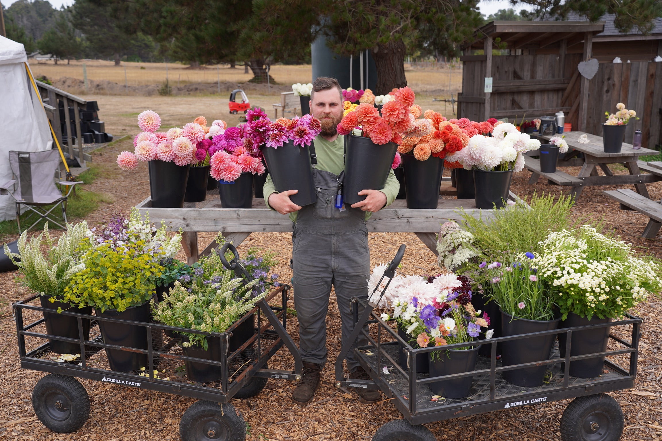We offer two types of DIY Flower Buckets: Mixed Flower Buckets, which contain approximately 50 to 70 stems of annual flowers and foliage, and Dahlia Buckets, which contain approximately 30 to 40 assorted dahlia stems. For reference, a simple mason-jar arrangement may take up to 20 stems, and a small bouquet will take up to 25-30 stems.